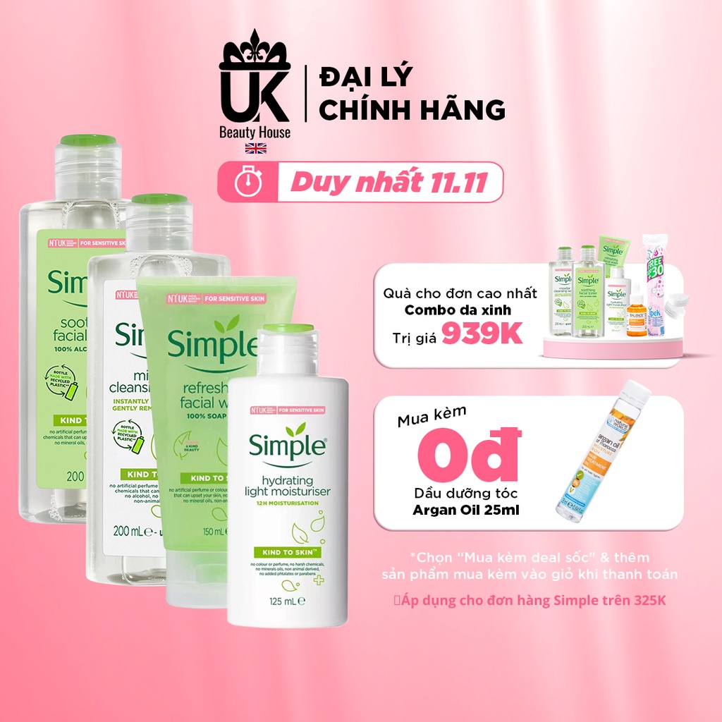 Combo dưỡng da trọn gói dịu nhẹ Simple (Tẩy trang + Sữa rửa mặt + Toner + Sữa dưỡng) free ship